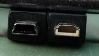 Mini-B USB on the left, Mini-A USB on the right (with white plastic inside the plug). Mini-A is the correct type for using as a host port connector. Note the difference in the metal keying structure, which allows 3 different sockets to be constructed, for A, B or both.