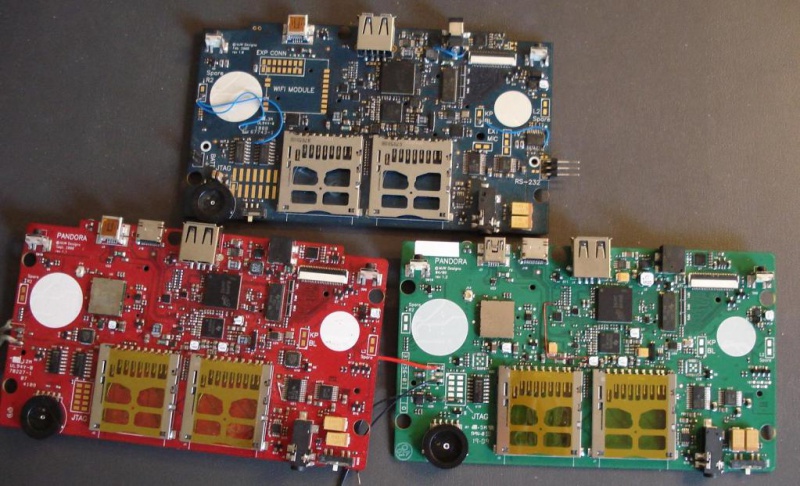 Three of the earliest pandora pcb board revisions. Blue Mk0 board top. Red board first seen(15 Oct 08) Right, green board.